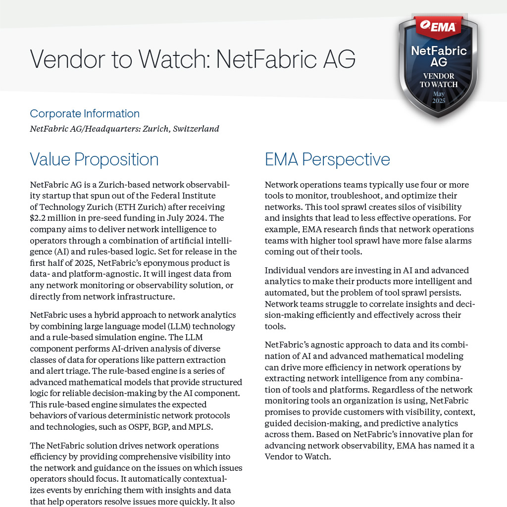 This document contains the 2025 EMA Vendors to Watch in the network infrastructure and operations field, including NetFabric.