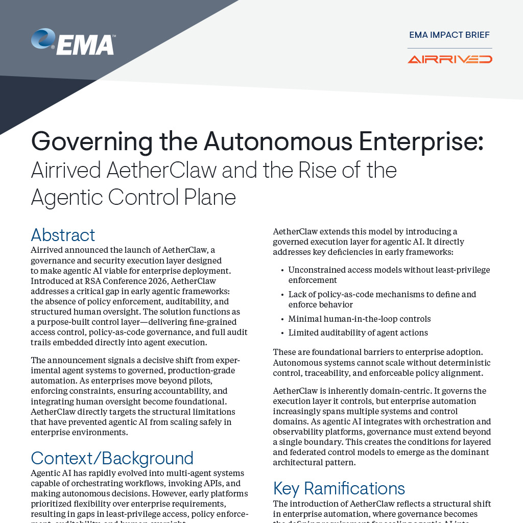 Category: Impact BriefAirrived announced the launch of AetherClaw, a governance and security execution layer designed to make agentic AI viable for enterprise deployment. Introduced at RSA Conference 2026, AetherClaw addresses a critical gap in early agentic frameworks: the absence of policy enforcement, auditability, and structured human oversight. The solution functions as a purpose-built control layer—delivering fine-grained access control, policy-as-code governance, and full audit trails embedded directly into agent execution.