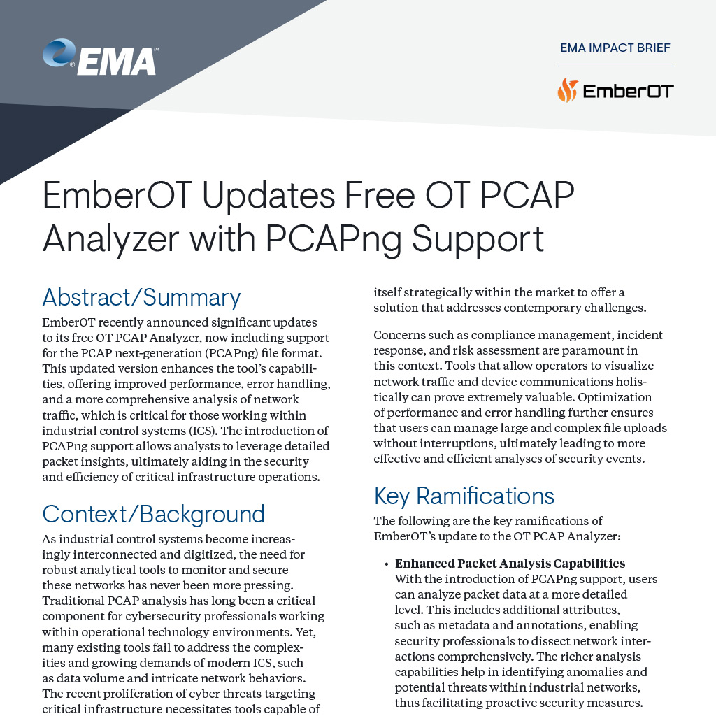 Category: Impact BriefEmberOT recently announced significant updates to its free OT PCAP Analyzer, now including support for the PCAP next-generation (PCAPng) file format. This updated version enhances the tool’s capabilities, offering improved performance, error handling, and a more comprehensive analysis of network traffic, which is critical for those working within industrial control systems (ICS). The introduction of PCAPng support allows analysts to leverage detailed packet insights, ultimately aiding in the security and efficiency of critical infrastructure operations.