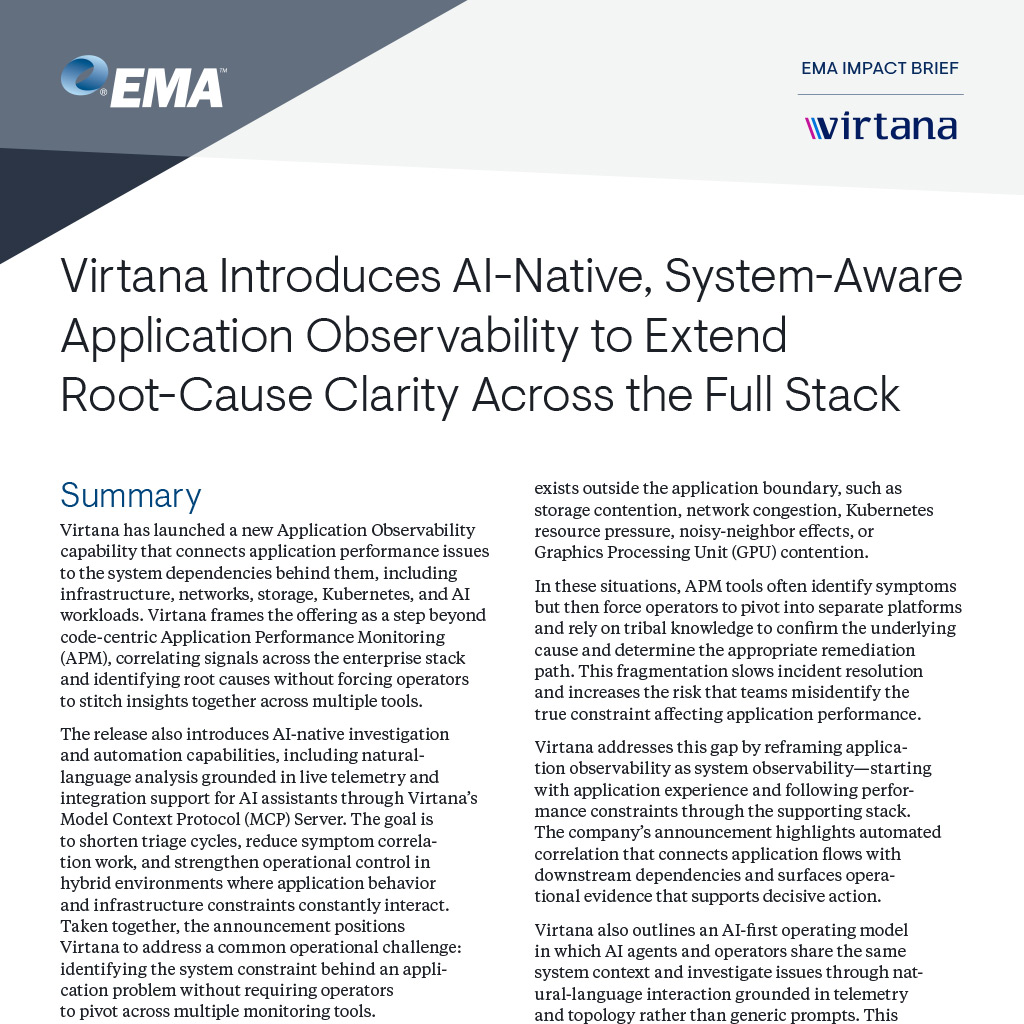 Category: Impact BriefVirtana has launched a new Application Observability capability that connects application performance issues to the system dependencies behind them, including infrastructure, networks, storage, Kubernetes, and AI workloads. Virtana frames the offering as a step beyond code-centric Application Performance Monitoring (APM), correlating signals across the enterprise stack and identifying root causes without forcing operators to stitch insights together across multiple tools.
