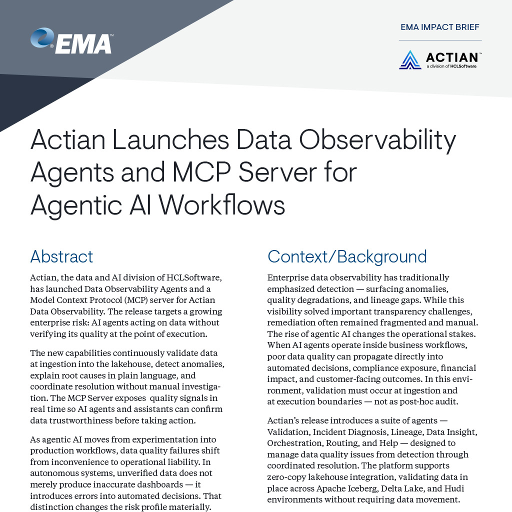 Category: Impact BriefActian, the data and AI division of HCLSoftware, has launched Data Observability Agents and a Model Context Protocol (MCP) server for Actian Data Observability. The release targets a growing enterprise risk: AI agents acting on data without verifying its quality at the point of execution.